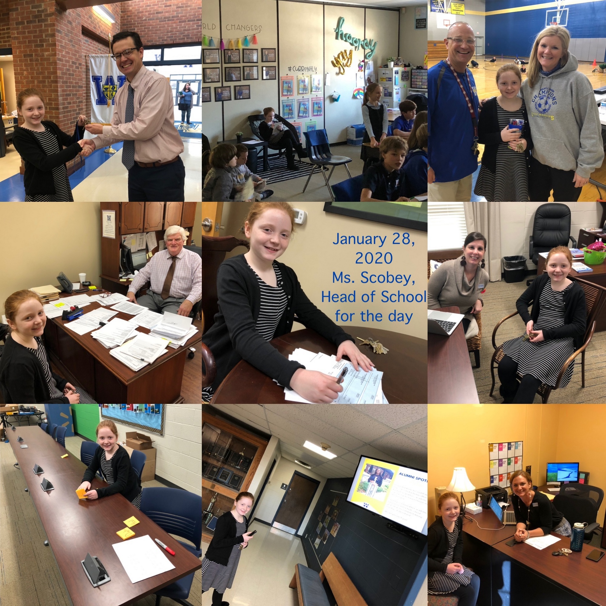 Ever wonder what it takes to run a school?  Your student will start the day by arriving and parking in their own private space.  They will sit with Mrs. Patty at the front desk from 7:30 – 8:00 a.m. and then join Mr. Moore as he walks the school, conducts important school meetings and finally a special lunch on the school in the cafeteria.  Also, a private parking space will be reserved just for your family for the 2020-21 school year!
