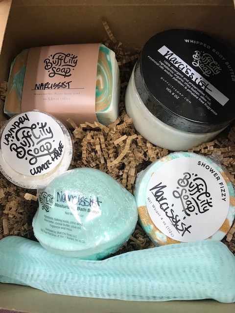 Buff City Soaps are loved by many and this fun package gives you an sample of the laundry in Narcissist scent.  It includes soap, a bath bomb, body butter, shower fizzy and a scrubby sleeve.