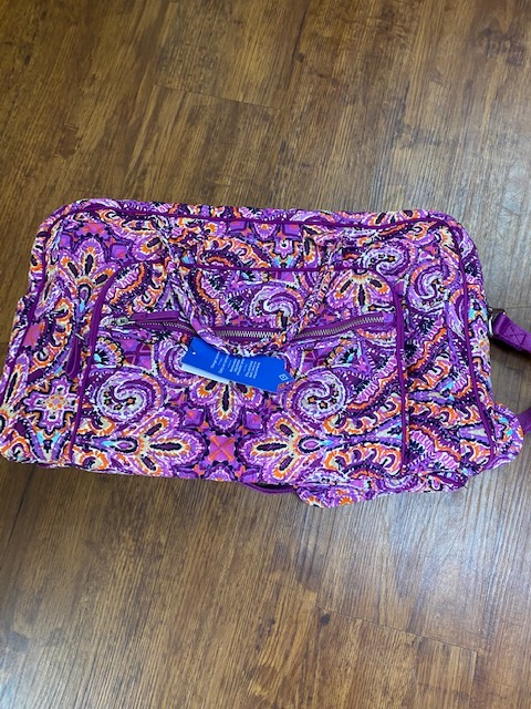 Purple Vera Bradley compact weekend traveler with charger pocket, carry-on compliant, removable strap and fits as a carry-on.