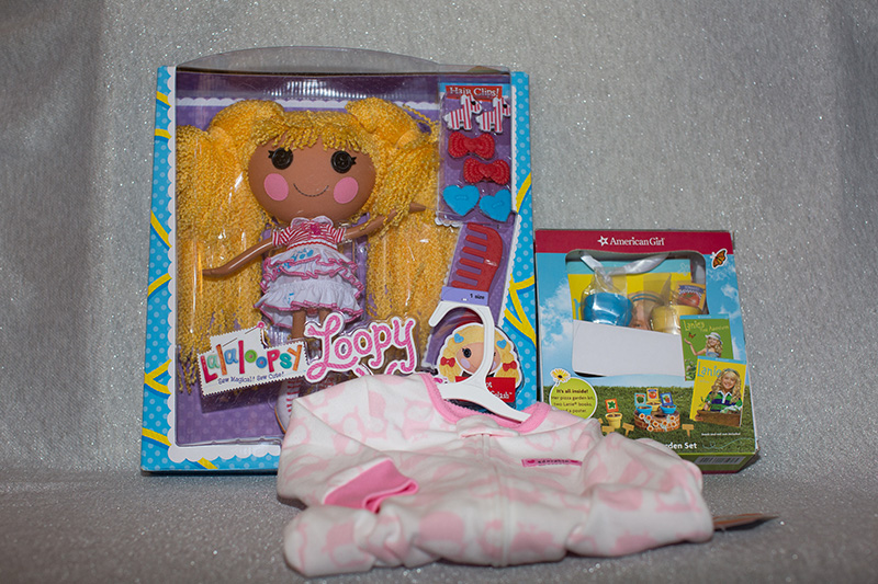 Girls birthday party items for your gift closet. This package includes an American Girl Doll Lanie's Pizza Garden Set, a Carter's pink sleeper (0 - 9 months), and a Lalaloopsy Loppy Hair Doll.