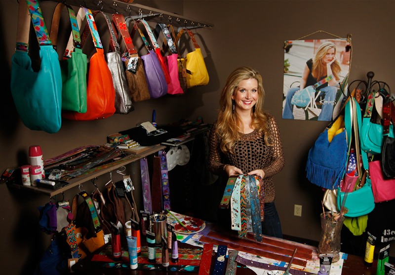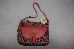 A vivid Boho leather coral hand bag with two straps designed by local Memphis designer Katie Kalsi.