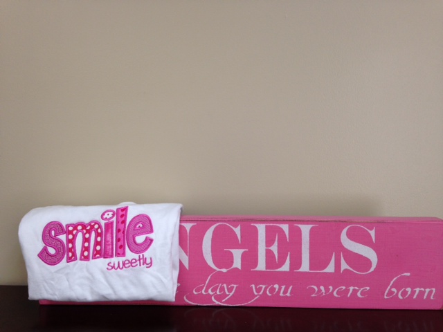 This pink package with a wooden saying sign and 4t pink smile sweetly t-shirt will make that perfect gift for that new mom.