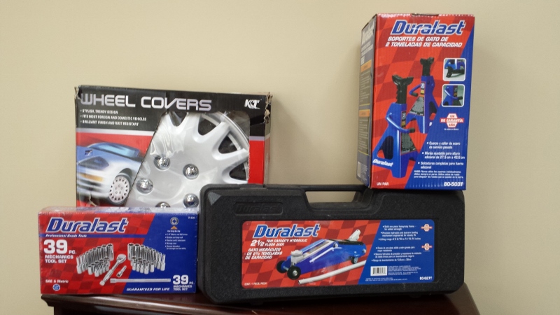 Spend a Saturday sprucing up your car tires with this tire set from AutoZone that includes wheel covers, AutoZone Floor jack, Duralast 39 piece mechanics tool set and Duralast jack stands.