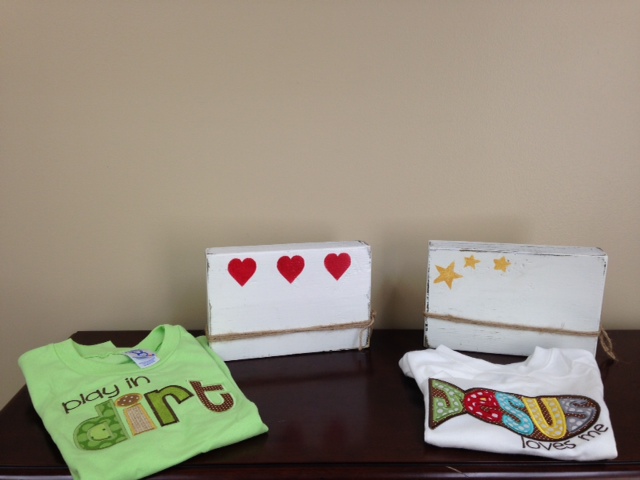 This shabby chic baby basket includes an 18 month Jesus Loves Me shirt, 24 month Play in Dirt Shirt, Heart picture block and a star picture block.